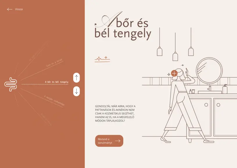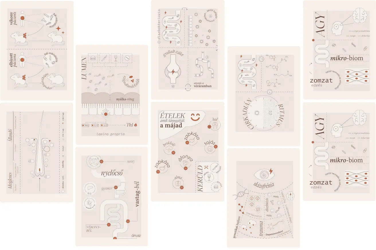 Our joint projects consistently inspire us, and the microbiome-focused initiative was no exception. The topic’s creative potential immediately sparked the imagination of our senior graphic designer, Fatime Kovács. The visual concept was shaped through in-depth professional consultations, resulting in a clear, aesthetically refined, and educational representation of the microbiome — the diverse community of microorganisms living in and on the human body. The illustrations and graphic elements form a cohesive knowledge-sharing toolkit that turns scientific content into an enjoyable, easy-to-digest experience.